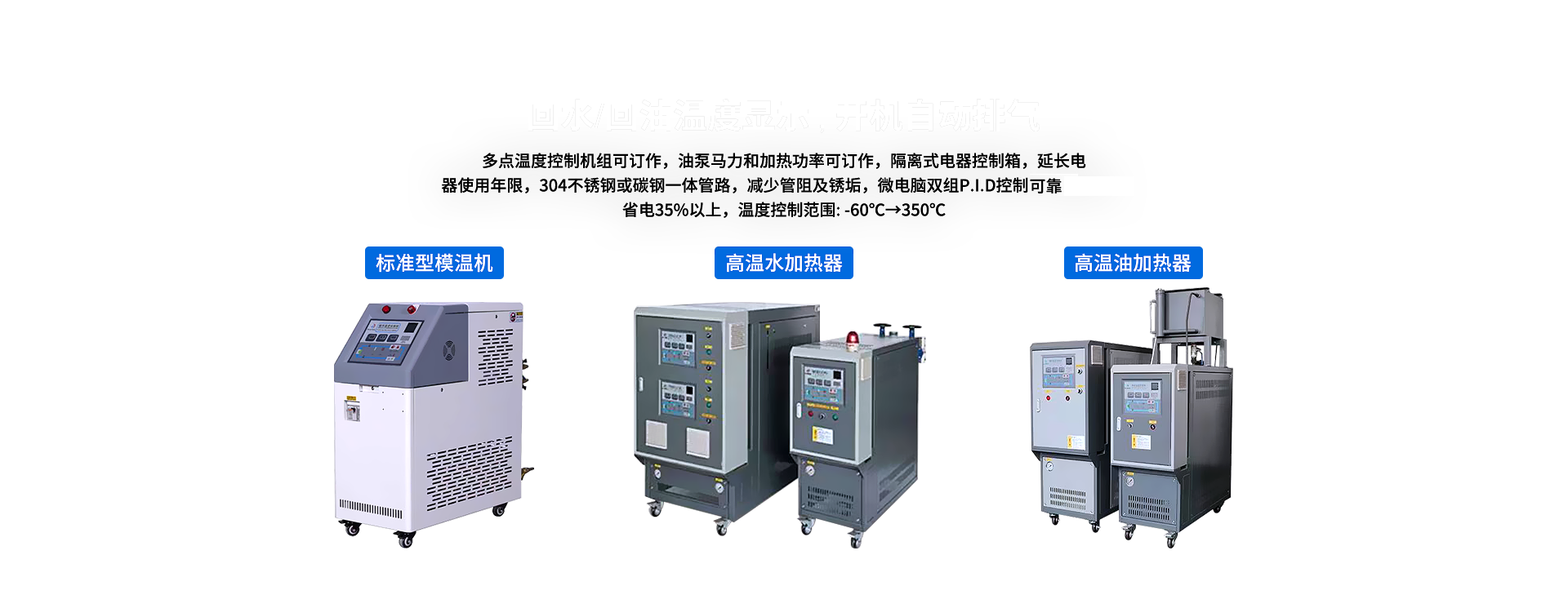 工業冷水機,工業冷風機,工業冷油機,工業機,低溫冷水機,低溫冷風機,低溫冷油機,螺桿式冷水機,冷熱一體溫控機,制冷機,電鍍冷水機,激光冷水機,鍍膜冷水機,化工冷水機,防爆冷水機,行業溫控機,模具除露機,模具恒溫機,高溫水加熱器,高溫油加熱器,塑料干燥機,冷卻塔,制冷制熱非標機等